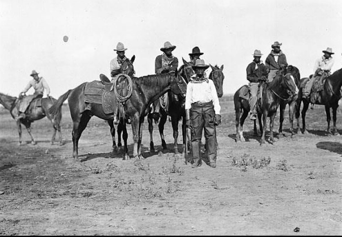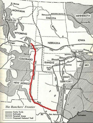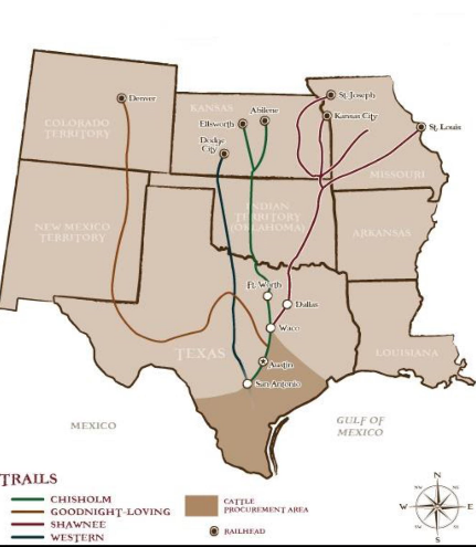 In the 30 years after the end of the Civil War well worn cattle drive trails developed taking cattle up from the Texas prairie to the railroad shipping points in Kansas, Colorado and Missouri to service the insatiable Eastern demand for beef. The most famous trails, the Chisholm, Goodnight-Loving, Shawnee and Western and their spur trials saw millions of head of cattle move north, and every drive required large groups of skilled cowhands. Throughout this period it was common to see expert Black and Mexican cowboys working herds, even groups consisting entirely of cowboys of color.