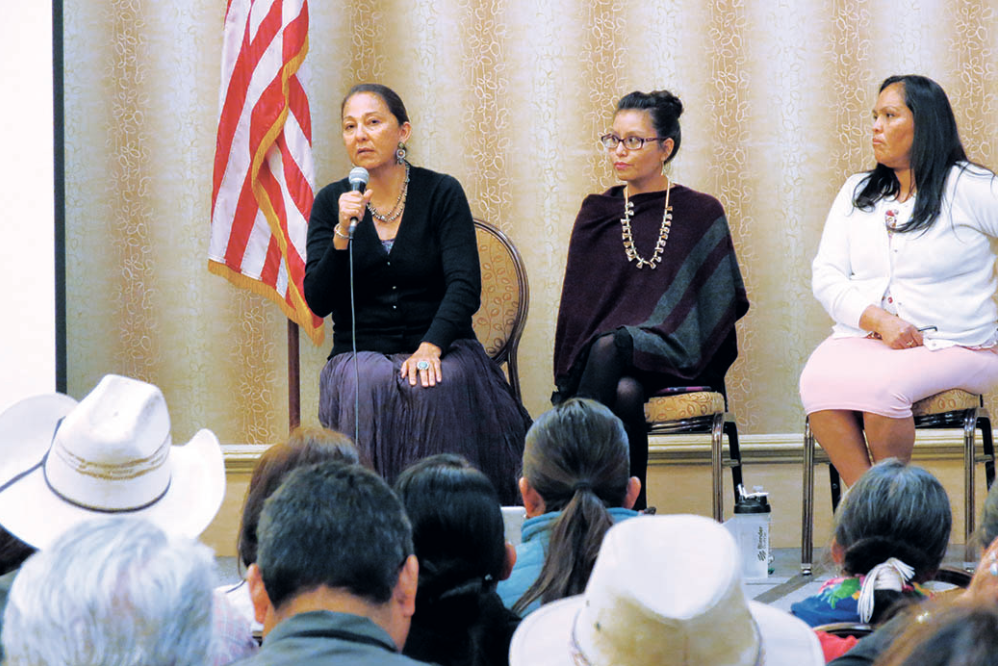 Nicole Horseherder (left), on a panel about protecting local water resources with Leiloni Begay (middle), and Tara Benally (right), answer questions about sustainability during the 2017 Navajo Governance Conference.
