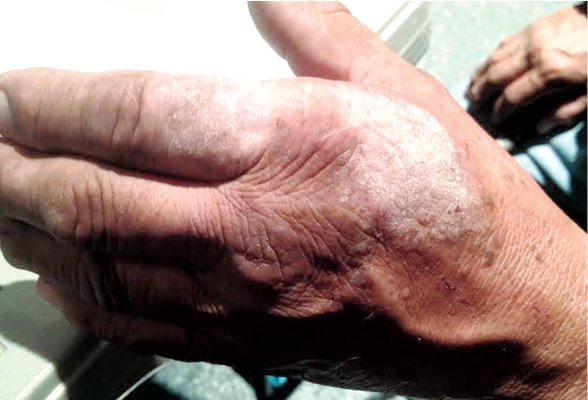 A lesion on Peterson Belle’s hand that he says has not healed in 20 years.