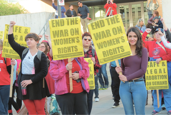 UNM students raise their hands in solidarity and hold signs to bring attention to concerns for women’s rights under the current administration.