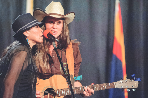 Kristina M. Jacobsen, right, author of ‘The Sound of Navajo Country,’ and singer Chucki Begaye sing a duet Friday in Window Rock.
