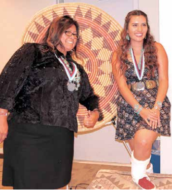 Telletha Valenski, left, gives a thumbs up to friends and family as she and Tyra Nicolay, right, are inducted into the 2017 Navajo Nation Hall of Fame Aug. 30.