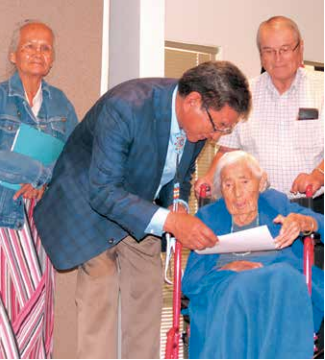 President Russell Begaye hands Katherine Mitchell Hardy, born in 1912, a certificate acknowledging her as an inductee into the 2017 Navajo Nation Hall of Fame for exemplifying traditional values at the ceremony Aug. 30.
