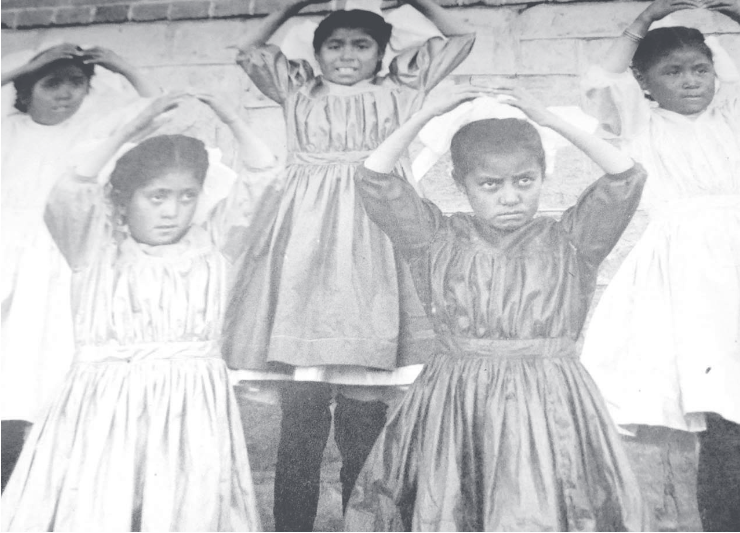 Close up of Schwemberger’s photo of nine Diné girls, with Eleanor Chee in the middle and others openly ex-pressing their contempt for the activity.
