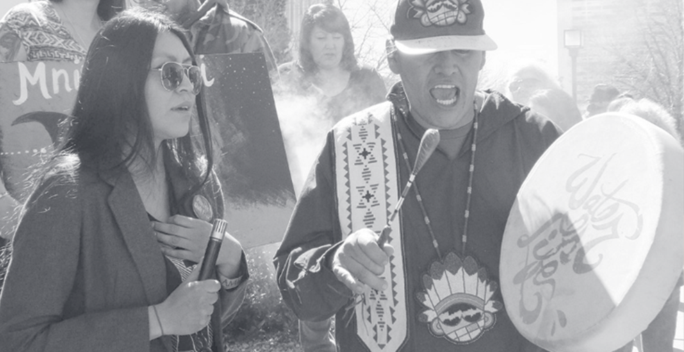 Actress and activist, Lynnette Haozous, San Carlos Apache/Diné, listens as Leandro Cruz, Santa Ana Pueblo, sings a song honoring wate...