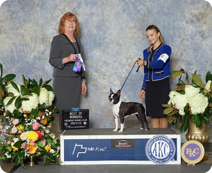 To enhance our breeding program and present our dogs in their best light, we work alongside a professional handler. Their expertise and knowledge in the world of dog shows complement our efforts, ensuring that our Boston terriers shine in the ring.