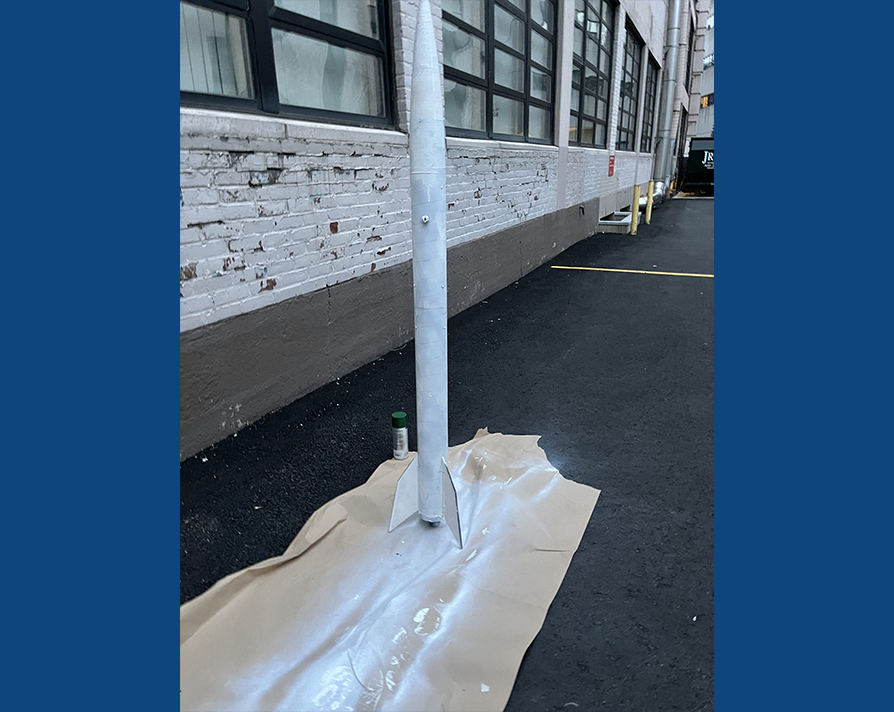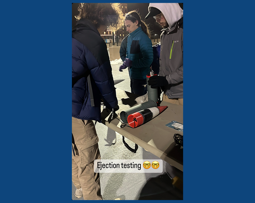 Throughout this process, periodic safety assessments conducted during our Design, Simulation, and Construction (DSC) Safety meetings led to occasional redesigns of specific elements. As the majority of the rocket took form and we safely introduced flammable materials, we carried out ejection testing with the university's approval on the school's parking garage rooftop. This testing ensured the proper connection and readiness for launch before the official launch date. Our commitment to regular meetings, initially on a weekly basis and later intensifying to two or three sessions per week as the launch date approached, fostered a climate conducive to effective progress and collaborative excellence. Finally, the rocket underwent a white paint application to emulate the appearance of rockets launched by NASA and JetBlue.