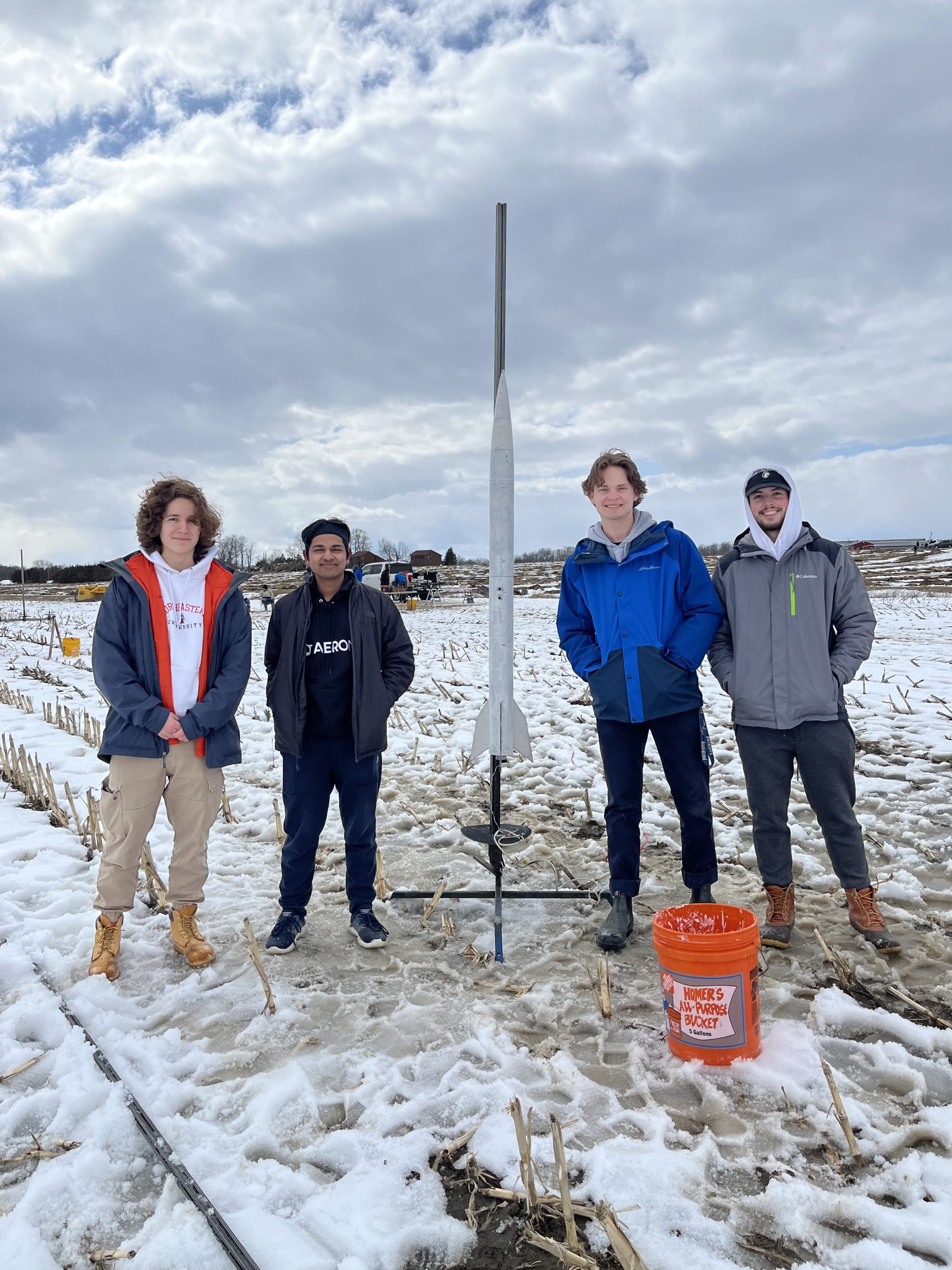 Regrettably, our rocket experienced an in-flight explosion attributed to a motor failure. However, it's important to note that such occurrences are not uncommon in the realm of engineering, and this setback did not render our entire project a failure. In fact, we found a silver lining in this incident as it brought to our attention that our rocket shared the same color as the clouds and snowy ground that day. Had the rocket continued its trajectory and landed further away, locating it would have posed a significant challenge.