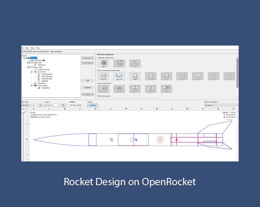 The primary focus of this project revolved around rocket design, with distinct responsibilities assigned to each team member. My role encompassed the design of the rocket's nose cone, blast caps, and fins, while Daniel assumed responsibility for circuitry and simulation tasks, and Eddie oversaw the construction of the Ebay cage, body tube, and coupler. The left-hand images displayed below showcase a selection of CAD models created using SolidWorks, instrumental in shaping our rocket's design, while the right-hand images depict simulations of our rocket's performance, executed through OpenRocket.