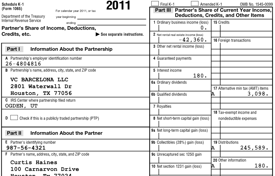 My 2011 K-1 from my first real estate acquisition. The address and tax identification numbers have been changed for privacy.