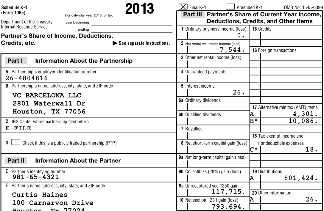 My 2013 K-1 from my first real estate acquisition. The address and tax identification numbers have been changed for privacy.