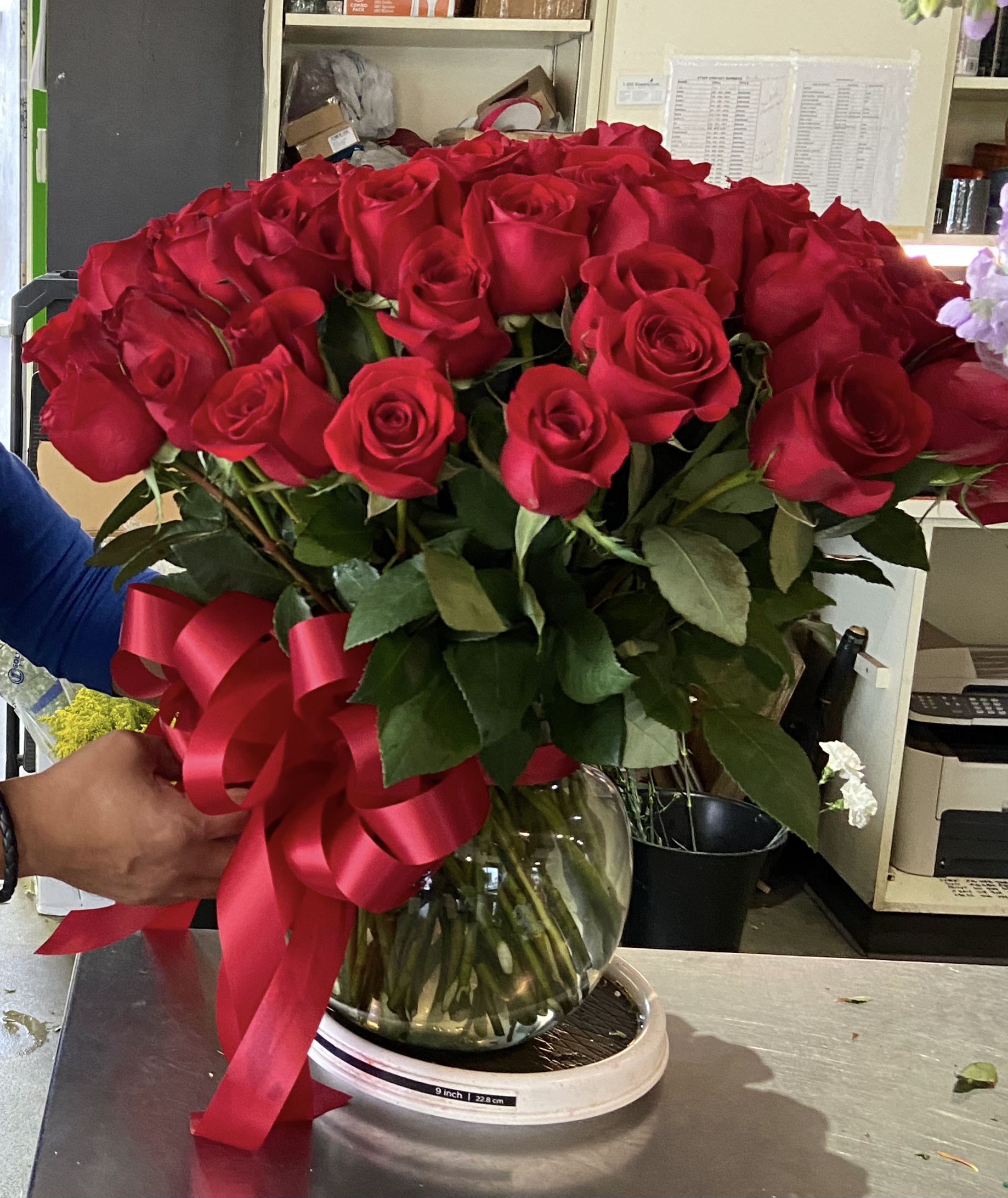 This arrangement consists of 100 red roses.