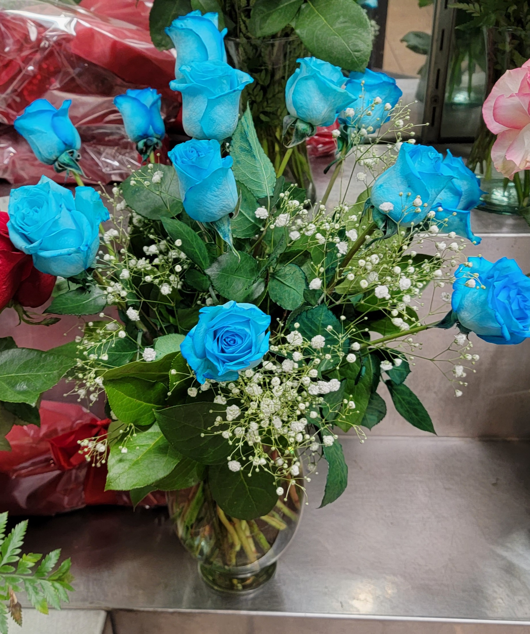 This arrangement consists of 12 blue dyed roses, baby’s breath and greens.