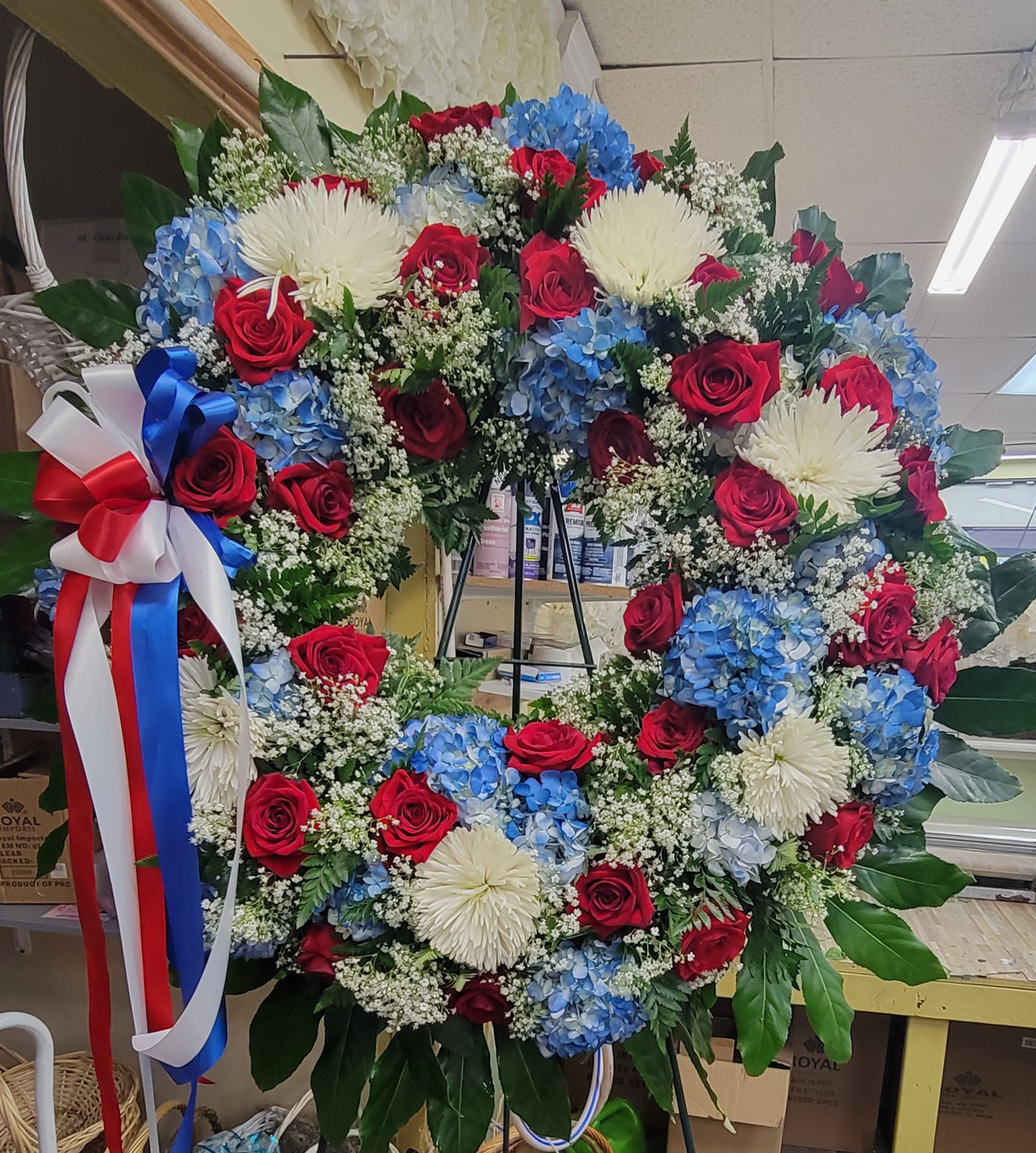 This arrangement consists of a combination of red, white and blue flowers on a 22 inch open wreath arrangement,