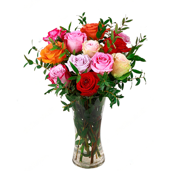 This arrangement consists of assorted colored roses with greens in a vase.