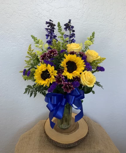This arrangement consists of yellow roses, sunflowers, blue delphinium, yellow snapdragon, saladego and greens.