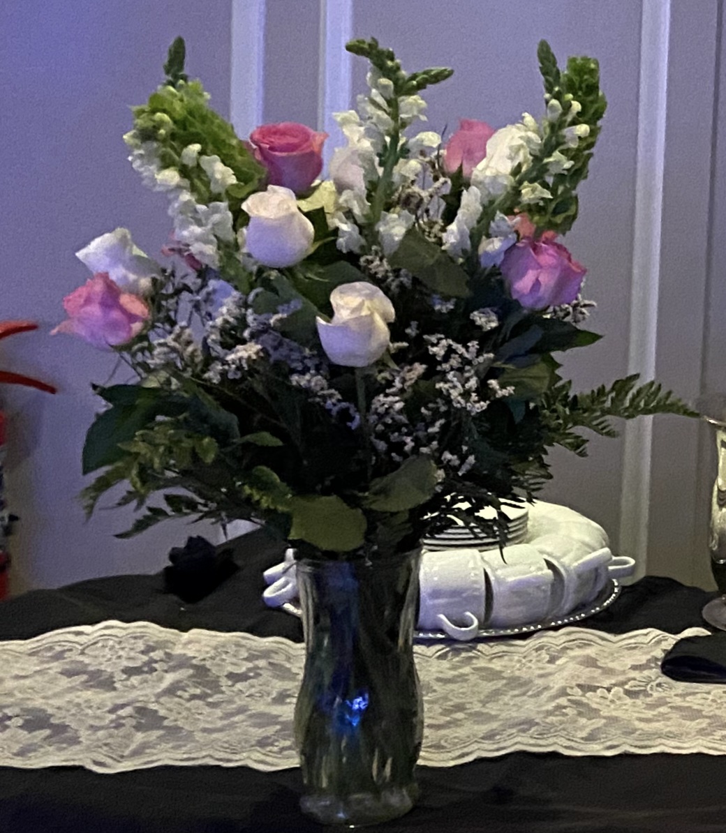 This arrangement consists of white roses, pink roses, white snapdragon and mixed greens.