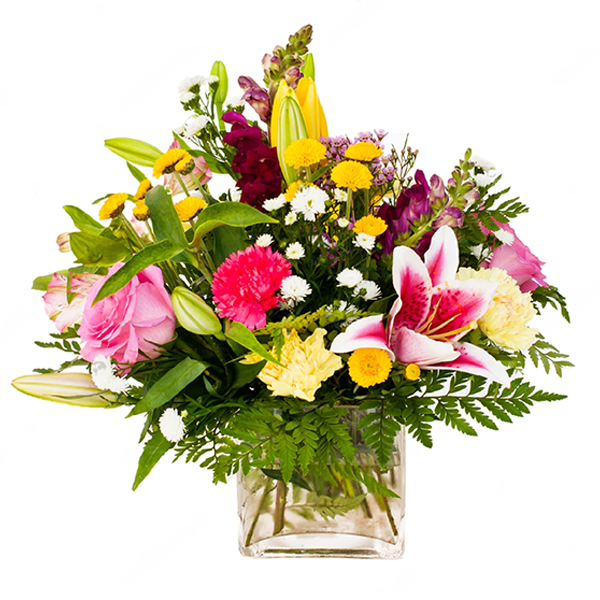 This arrangement consists of 2 types of lilies(pink stargaze and yellow asiatic), pink roses, hot pink carnations, yellow buttons,greens mixed filler in a 5 by 5 cubed vase.
