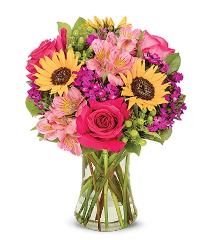 This arrangement consists of hot pink roses, pink alstroemeria, sunflowers and mixed greens.