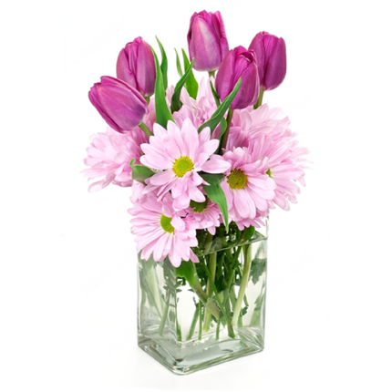 This arrangement consists of half dozen tulips(any color) daisy pompoms (any color) in a cubed 5 by 5 vase.