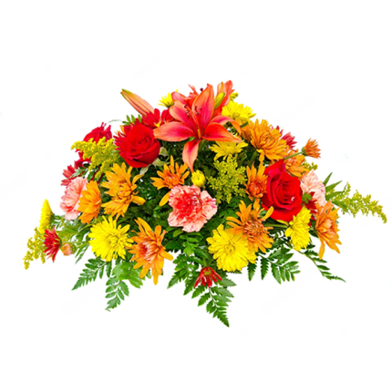 This arrangement consists of peach and pink roses, orange lilies and mixed greens.