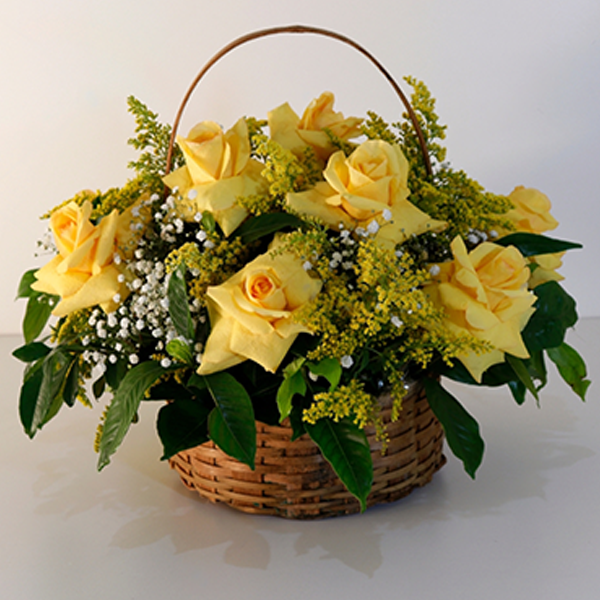 This arrangement consists of yellow roses, greens and mixed filler( saladego and babies breath) in a 8 inch wooden basket.