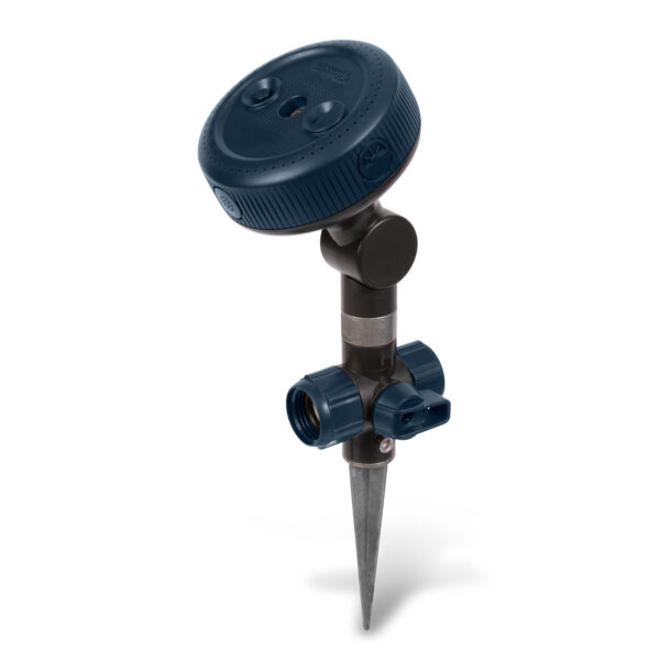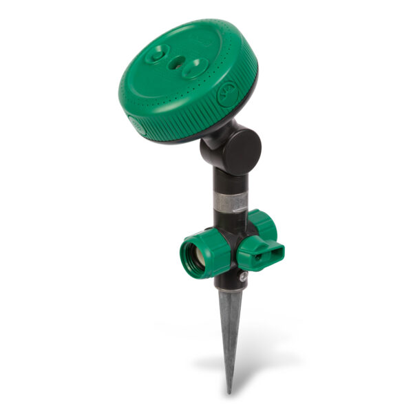 The Gilmour® Pivoting Multi-pattern Sprinkler Spike with On/Off Switch is ideal for precisely targeted watering of garden beds, irregular areas and new seedlings. Its infinitely adjustable head pivots 180° and rotates 360°, allowing you to aim the continuous spray exactly where you want, from any angle you want, without having to move the sprinkler. 4 spray patterns ensure you always have the right fit – inner shower for soaking, outer shower for rain-like spray, half-circle for edges and full-circle for larger areas. The base features an on/off switch that eliminates trips to the spigot and an outlet valve for connecting multiple sprinklers. Its durable metal spike provides stability in softer soil and on uneven ground.