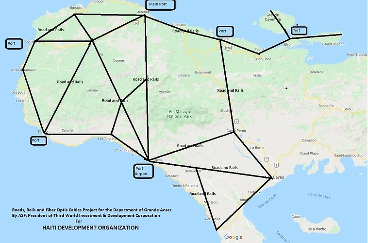 7.  A web of 300 miles of rails with tracks switching capability, 500 miles of highways and roads including improvement of existing roads. We might have to build a tunnel or a bridge from Etroy to Grande Cayemite, from Port-de-Paix to La Tortue and from Montrouis to Anse-à-Galet, La Gonave.